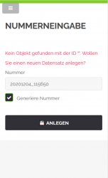 Schritt 1 - Nummerneingabe: Sie werden aufgefordert eine Kennnummer des neuen Objekts anzugeben, was sie über das dafür vorgesehene Feld machen können. Diese Kennnummer wird fortan verwendet um dieses Objekt identifizieren zu können, daher muss diese Nummer eindeutig sein und darf nicht mit der Kennnummer eines bestehenden Objekts übereinstimmen. Aus diesem Grund wird empfohlen, die automatisch vom System generierte Kennnummer zu verwenden. Es kann aber auch eine andere, beliebige Nummer vergeben werden. Die Nummer sollte keine Sonderzeichen (außer Minus - und Unterstrich _) enthalten, darf aber Buchstaben und Zahlen enthalten. Mit einem Klick auf den Button "Anlegen" wird ein Objekt angelegt, welches Sie im nächsten Schritt spezifisch bearbeiten können.