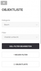 Ein Beispiel: Die Stadtverwaltung besitzt eine Kategorie Baum, um die Bäume in ihrer Stadt verwalten und pflegen zu können. Die Stadtverwaltung möchte sich nun einen Überblick über die Anzahl der Bäume machen, deren Vitalität mangelhaft ist. So wählt nun die Stadtverwaltung die Kategorie "Baum" und wendet innerhalb der Objektliste einen "Objektfilter" an durch Klicken auf den entsprechenden Button. Über das Feld "Filter" wählt sie nun die Eigenschaft "Vitalität mangelhaft" aus. Nach dieser Eingabe, werden ihr unterhalb der Eingabe alle Bäume, deren Vitalität schlecht ist, angezeigt.