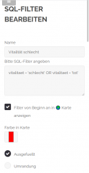 Nachdem Sie einen Filter bearbeitet bzw. erstellt haben, können Sie den Vorgang mit dem Button "Filter Speichern" abschließen. Für Kunden, welche über die entsprechende Lizenz zur Nutzung der Karte verfügen, können bei der Erstellung und Bearbeitung von Filtern zusätzliche Einstellungen für die Ansicht des Filters in der Karte vornehmen. Mehr dazu erfahren Sie im Kapitel Karte